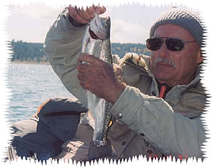 at the outlet of Lewis Lake, Yellowstone. Jackson Hole was our base and we fished the Green, Lewis Lake and lots of small streams, late July/early August 1998. Many rivers were muddy from heavy rains. We had limited success and had to work hard for that. |