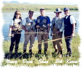 | About to descend on the Henry's Fork, August 1997 Both David and Shan had the good fortune to marry beautiful ladies with a love for fly fishing. We fished half a day and caught Rainbows, but most of the big ones either threw the hook or broke off. We also spent an afternoon on the Madison in the Park, lots of small Rainbows but no one caught anything large. A Better day on Slough Creek, with Dave landing a 19" Cutthroat. Bob fished Henry's Lake at mid-morning, a rather poor time, but did land two 14-16" Cutthroats before it turned off. Our best effort was on our last day, Trout Lake at sunset, many large Cutthroats. |